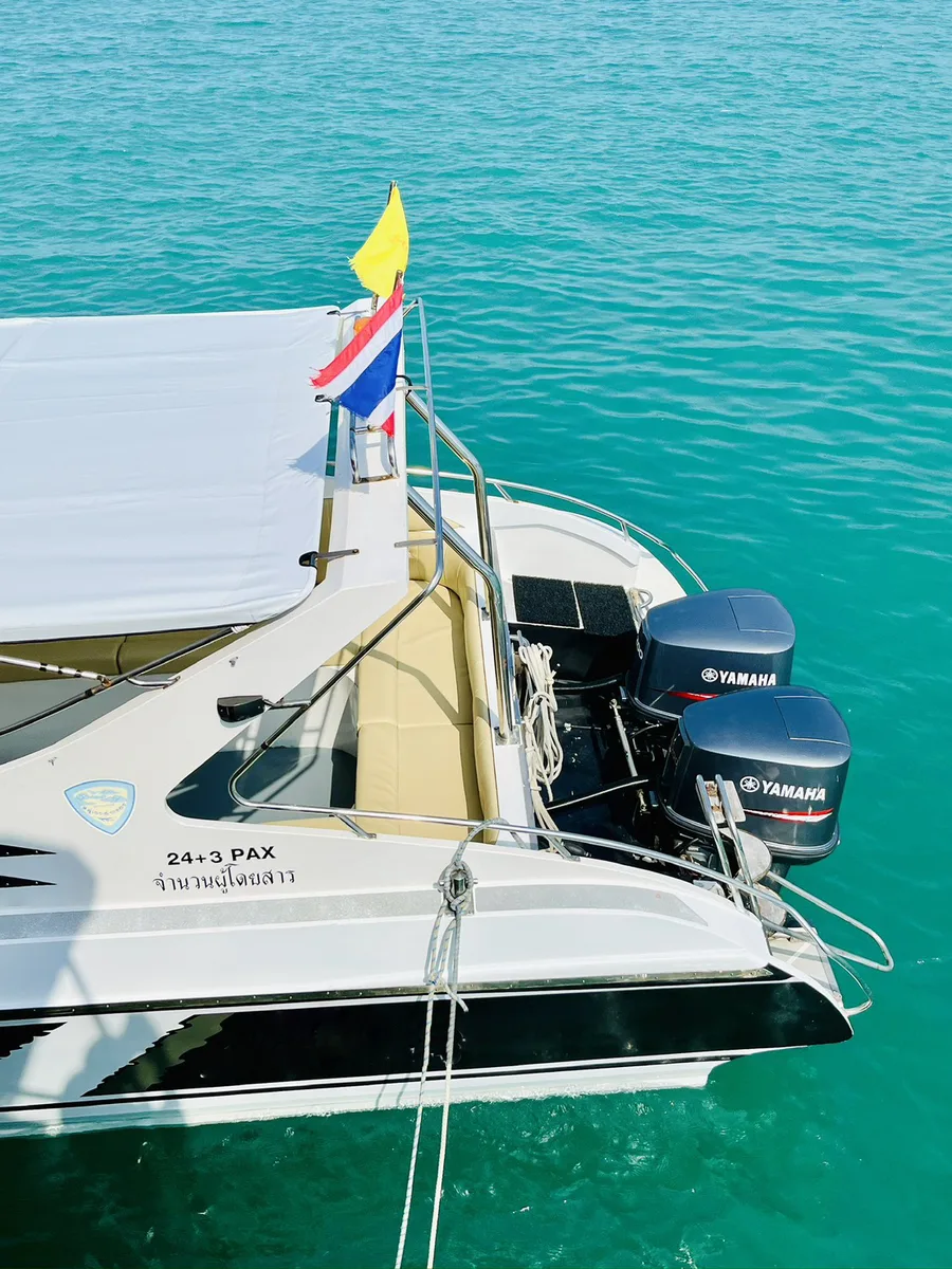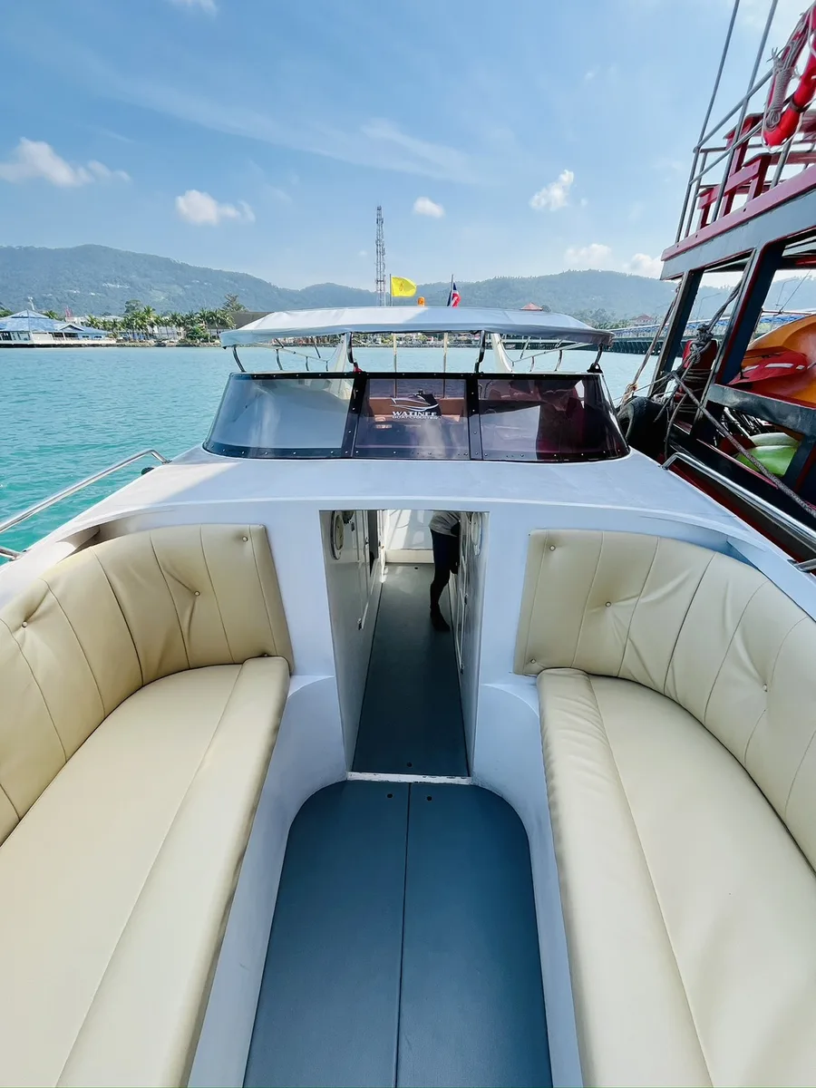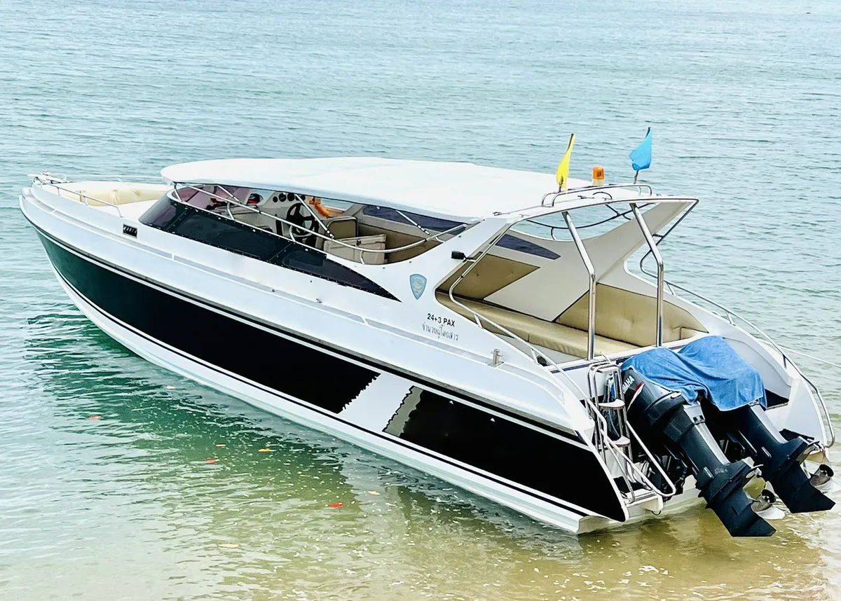 The twin-engine 12-meter speedboat for private Charters at Samui is licensed for up to 24 people, perfect for group size of 12. She guarantees comfortable and fast rides to the islands of Ang Thong Marine Park, Koh Tao and Koh Phangan. Build in toilet, fresh water shower and sound system.