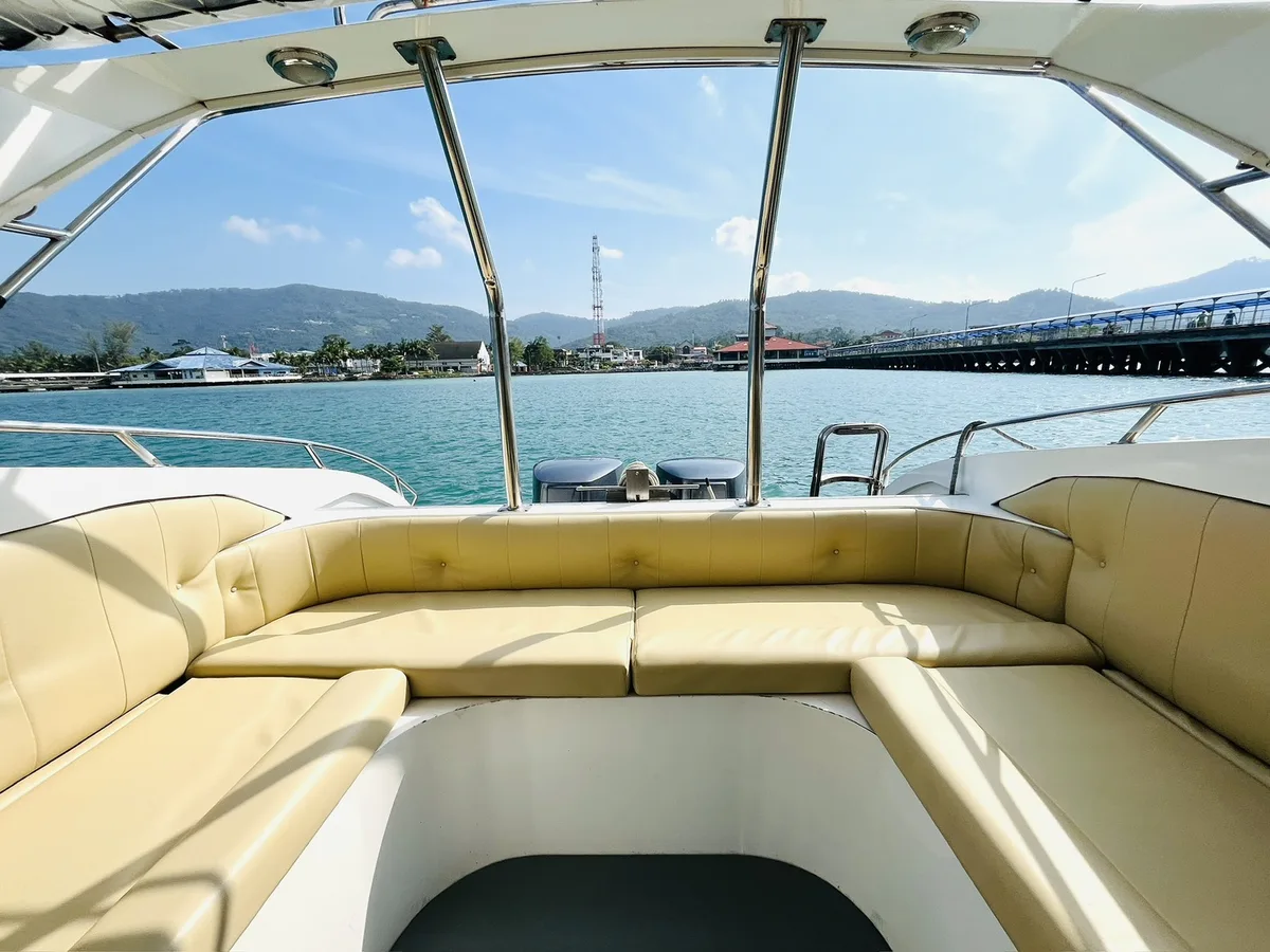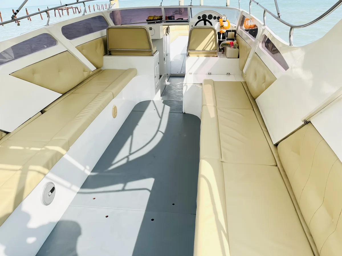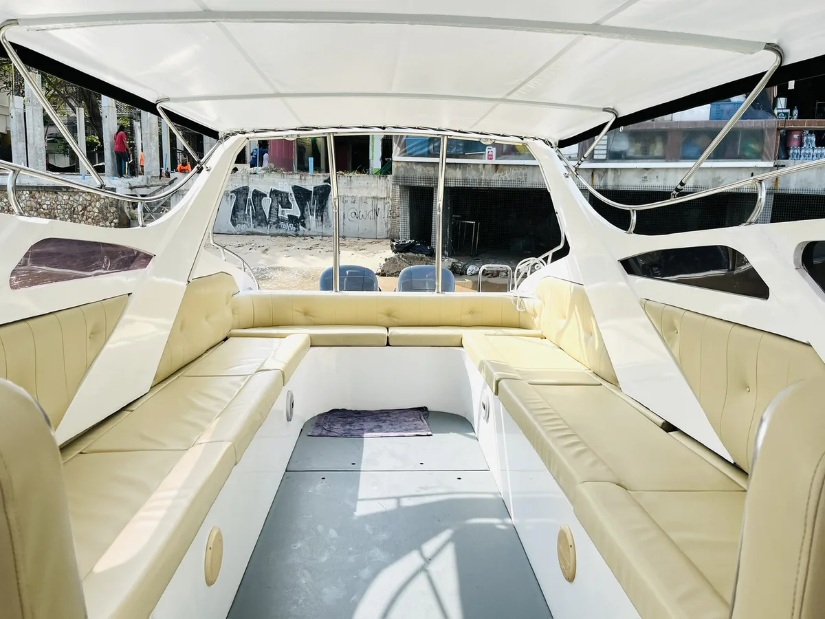The twin-engine 12-meter speedboat for private Charters at Samui is licensed for up to 24 people, perfect for group size of 12. She guarantees comfortable and fast rides to the islands of Ang Thong Marine Park, Koh Tao and Koh Phangan. Build in toilet, fresh water shower and sound system.