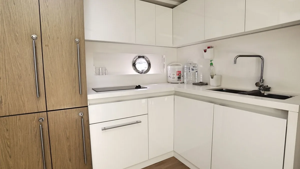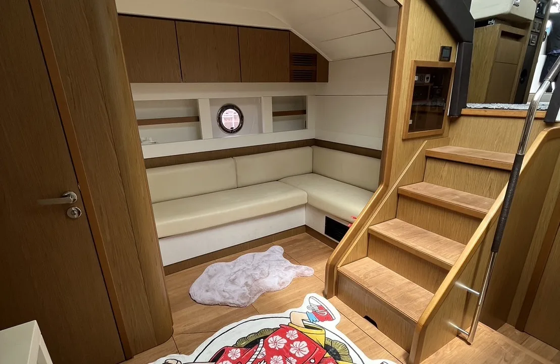 On board, the living spaces have been designed to enjoy moments of relaxation and interaction. Below deck, 2 fully air-conditioned large double cabins and a small lounge area await up to 4 overnight guests. A budget-friendly option for anyone looking to rent a motor yacht in Phuket.