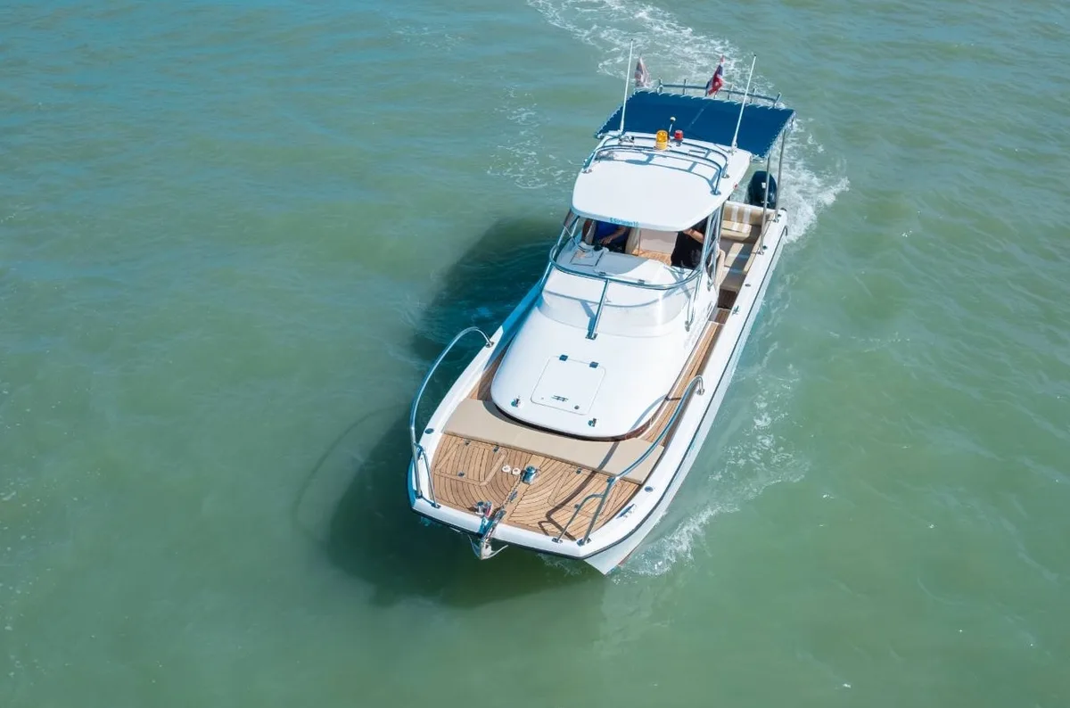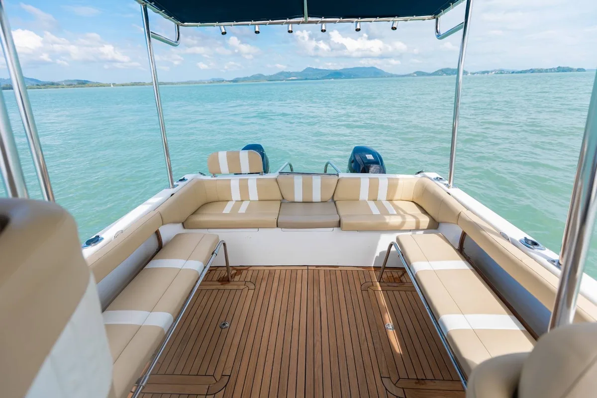 The Boomerang 29 is a sleek and agile speed catamaran, perfect for island-hopping adventures to Phi Phi, Phang Nga Bay, and beyond. With a smooth ride even at higher speeds of up to 35 knots, she gets you to the highlights quicker — so you can spend more time exploring. Equipped with a small cabin, toilet, and freshwater shower, Boomerang 29 offers just the right comfort for full-day trips with up to 6 guests. Shaded seating, an easy-access swim platform, and storage for gear make it ideal for groups looking for a fast, flexible, and fun day on the water.
