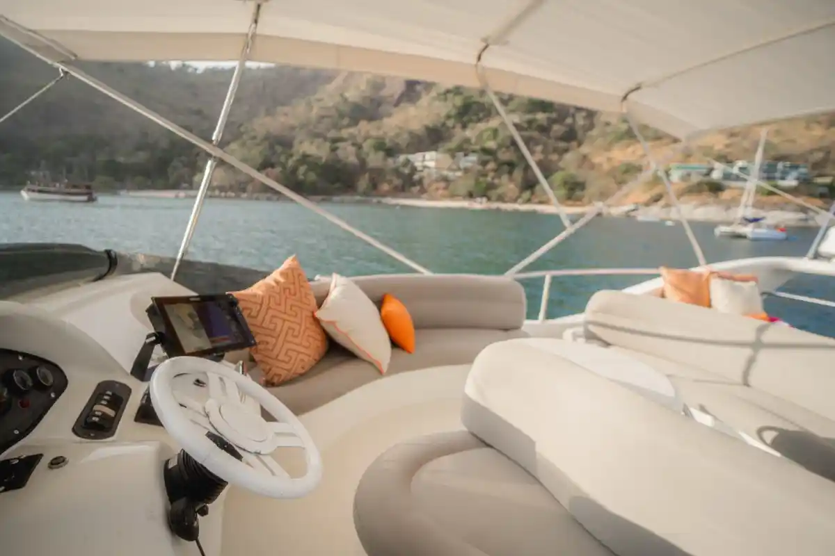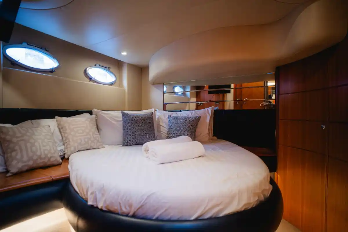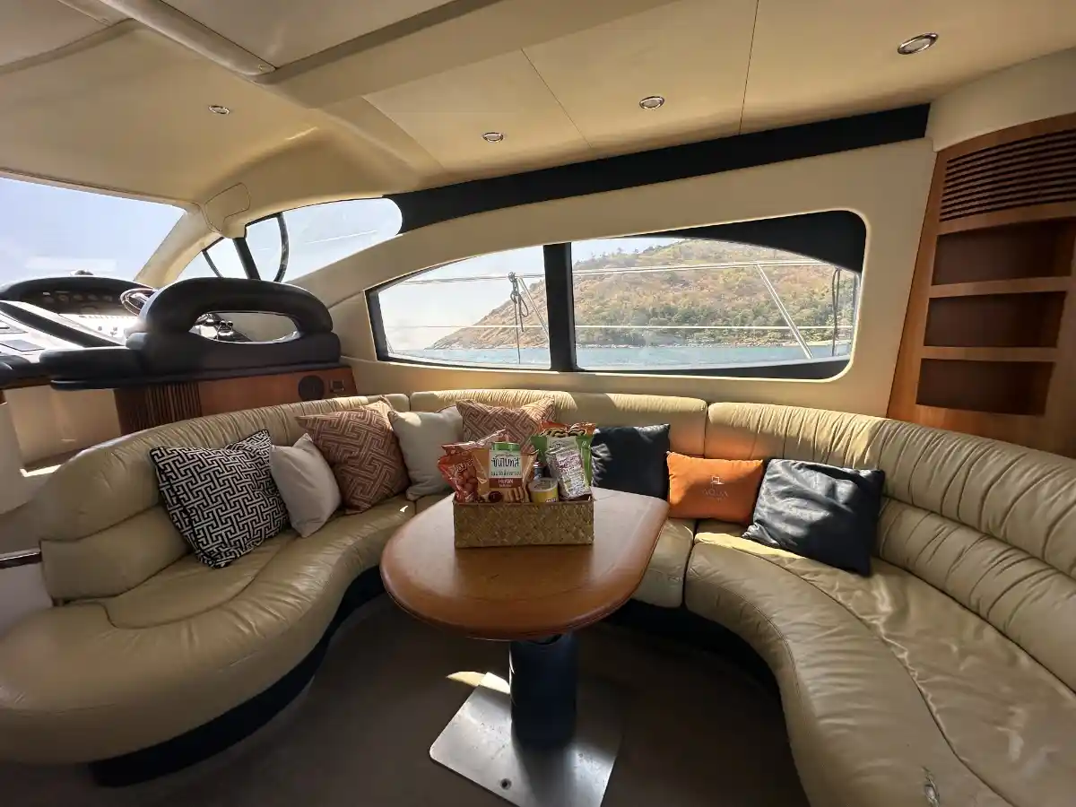 The Azimut 46 is a classic Italian motor yacht for charter offering comfort and style for cruising the islands around Phuket. Recently refitted (2003), she’s well-maintained and ideal for small private groups for up to 12 guests. Enjoy spacious outdoor seating, a flybridge with panoramic views, and a cozy interior with two cabins for up to 4 overnight guests. An optional floating pool adds extra fun and safety at anchor — ideal for families or relaxed swim stops.