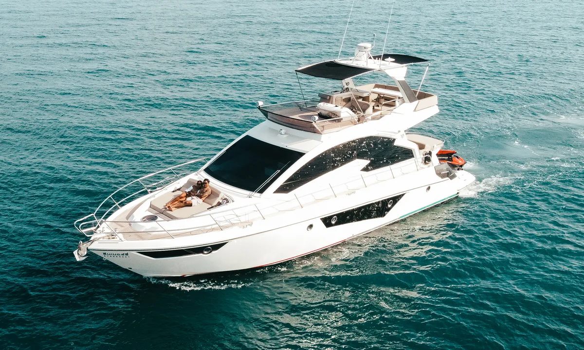 And ideal for those who enjoy cruising to farther destinations with speed and comfort while indulging in luxurious amenities and enjoying a wide array of watertoys. The spacious flybridge provides the perfect spot to relax and take in panoramic views, while the fully air-conditioned interior features a stylish salon, a fully equipped galley, and three elegant cabins for a truly unforgettable experience.