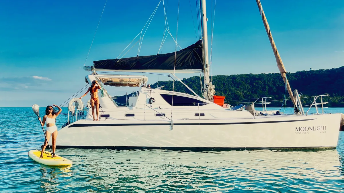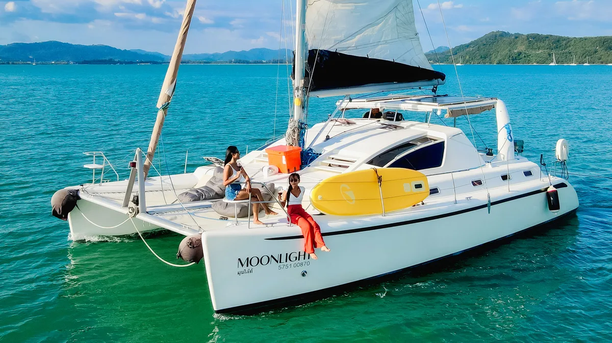 A stylish gem among Phuket's charter fleet, Moonlight is perfect for small groups of up to 10 guests (registered for 20) or 4 overnight guests seeking an authentic sailing experience in the Andaman Sea. Her thoughtfully designed layout maximizes comfort and deck space, while twin-hull stability ensures smooth sailing for everyone aboard. This boat can also be rented with self-catering and skipper only. Please contact us if you are interested.