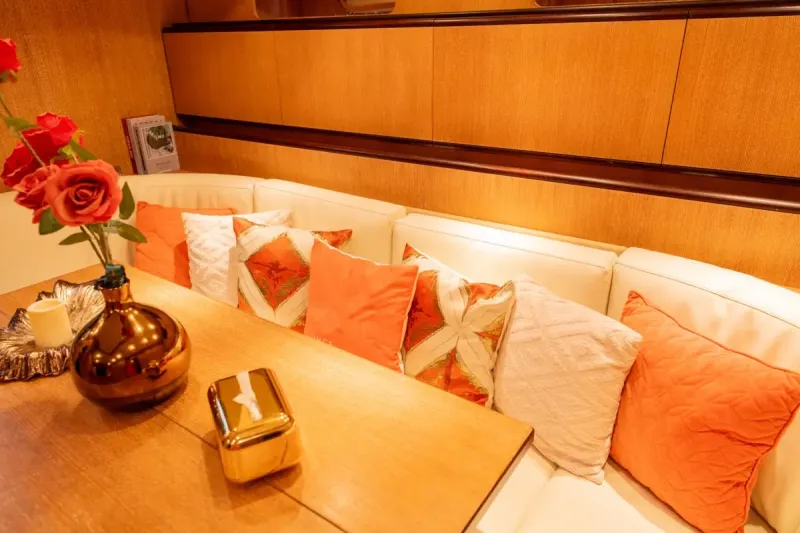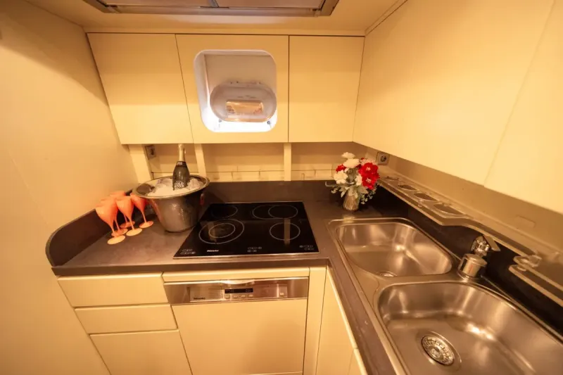 Below deck, the interior offers elegant accommodation for six guests across three beautifully appointed cabins, each with en-suite facilities. The full-beam master suite, located amidships, boasts exceptional volume and natural light, while a forward VIP cabin and a twin guest cabin provide additional comfort and privacy.