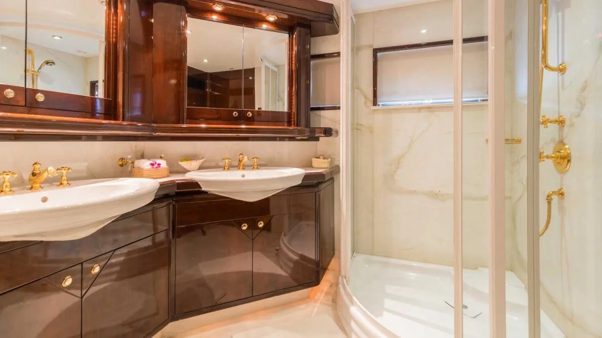 Welcoming eight guests, the yacht offers four luxurious staterooms. Her full-beam, main-deck master suite is fitted with a skylight to dazzle stargazers, and includes a king-size bed, en-suite bathroom with gold-plated fixtures, and a private office with an optional sofa bed for a 9th adult or child guest. The VIP and two additional double staterooms are located on the lower deck, and complete with their own en-suite bathrooms.