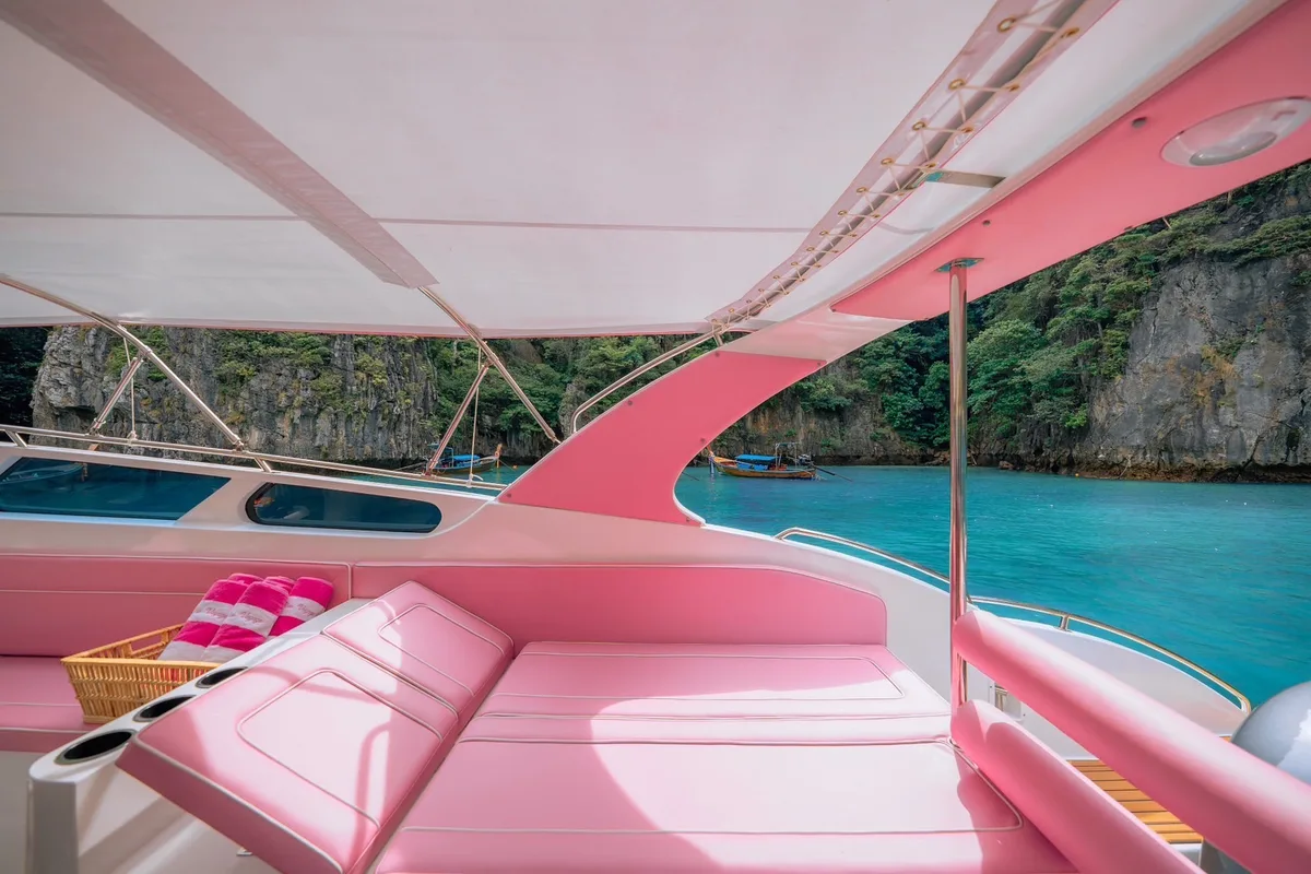 This rental speedboat in Krabi looks a bit like a Barbie vehicle, but has a lot of power built in and takes groups of up to 20 people comfortble to the most beautiful destinations in the Andaman Sea in the shortest possible time. Best service included!