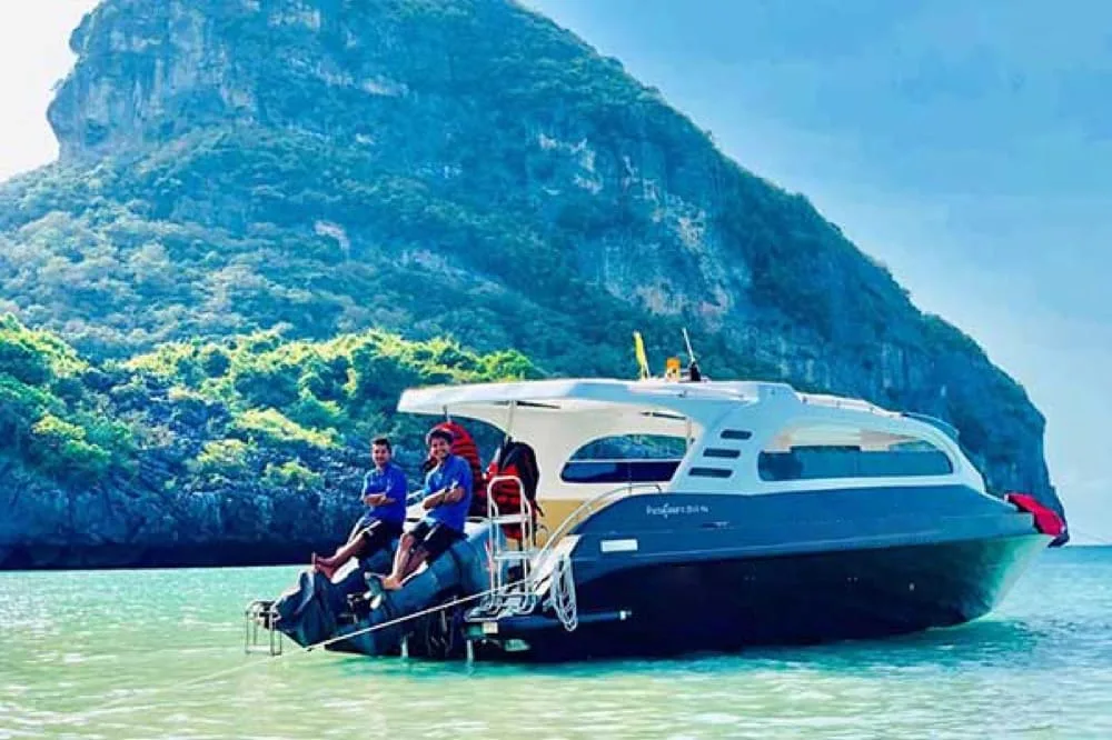 เรือสปีดโบ๊ทเครื่องยนต์เดี่ยวขนาด 30 ฟุตสำหรับชาร์เตอร์ที่ Samui เหมาะสำหรับคู่รักและครอบครัวเล็กที่ต้องการทัวร์เกาะแฮปปิ้งครึ่งวันในราคาสมเหตุสมผลเพื่อสำรวจเกาะร้างทางตะวันตกเฉียงใต้ การชาร์เตอร์ส่วนตัวนี้รวมถึงการตกปลา การดำน้ำดูปะการัง การเกาะแฮปปิ้ง การปิกนิกบนชายหาด และแม้กระทั่งการชมโลมาสำหรับผู้โดยสารสูงสุด 10 ท่าน
